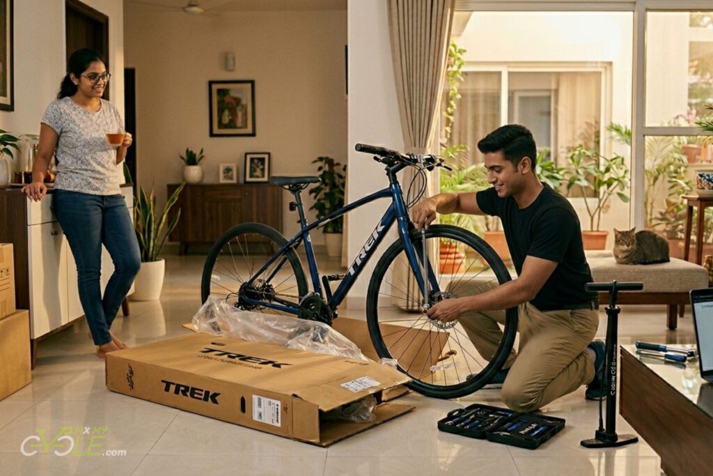 Bought a new bicycle online? Don’t risk a DIY setup. Improper assembly of derailleurs, brakes, and cranksets can void your manufacturer’s warranty and compromise your safety on the road. FixMyCycle provides expert, factory-standard New Bicycle Assembly for all major brands—including units purchased from Amazon, Flipkart, Decathlon, Trek, Giant, Specialized, and many other online retailers. Our technicians arrive at your location to handle the complete unboxing, frame integrity check, precision component greasing, and torque-calibrated assembly. We transform your boxed purchase into a road-ready machine, ensuring every bolt meets strict factory safety specifications. Start your first ride with absolute confidence—let the professionals handle your new build.